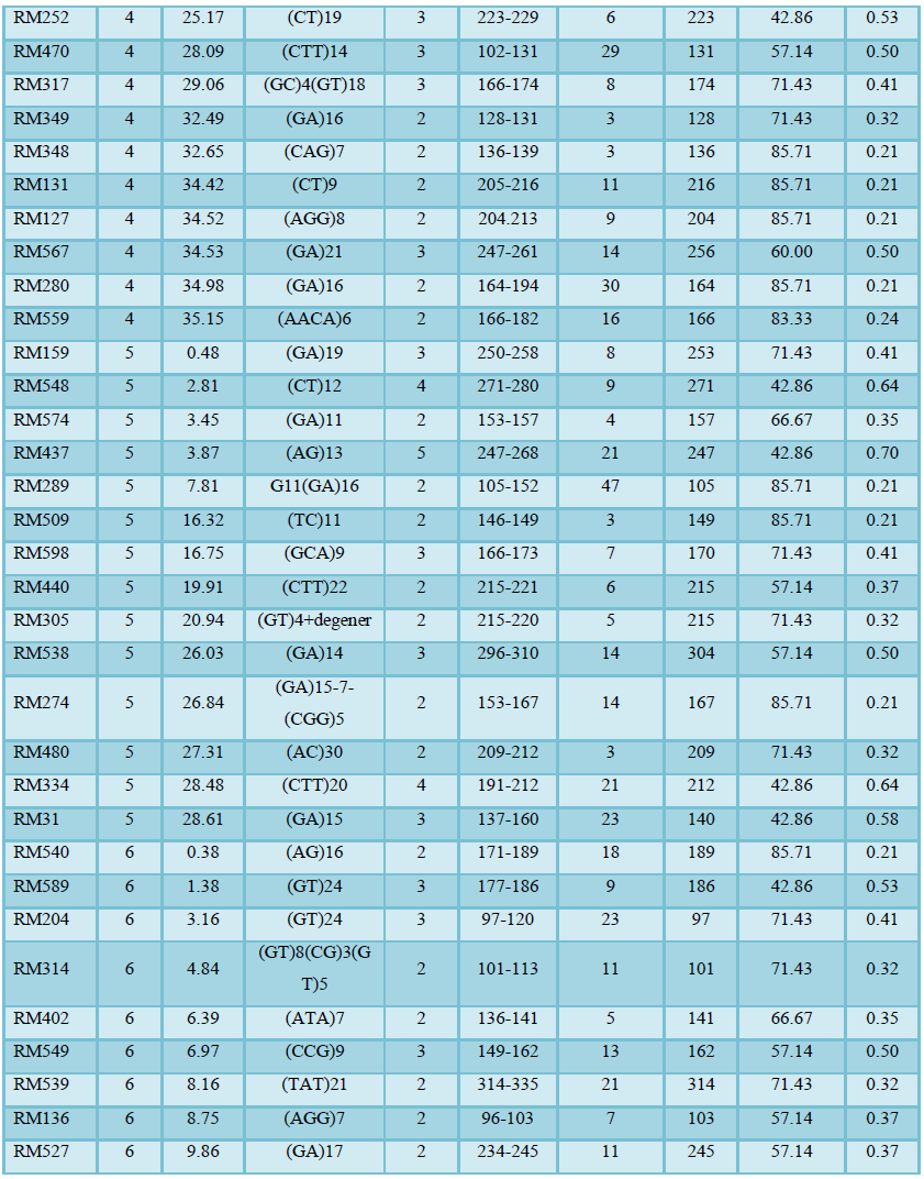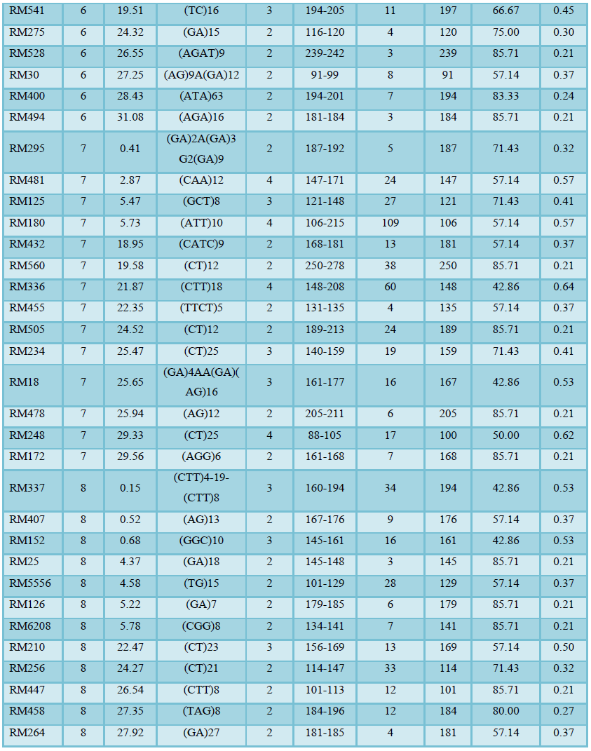 PIC values, a reflection of allele diversity and frequency among the varieties, were calculated for all the markers. The PIC values for the microsatellite loci varied from 0.21 to 0.70 with a mean of 0.36. Among the markers used in the present study, RM 437 on chromosome 5 is highly informative since it recorded high PIC value (0.70). Total 43 primers, 5 primers (RM493, RM9, RM212, RM472, RM519) on chromosome 1, 7 primers (RM154, RM279, RM423, RM263, RM526, RM250, RM208) on chromosome 2, 4 primers (RM232, RM570, RM442, RM85) on chromosome 3, 3 primer (RM252, RM470, RM567) on chromosome 4, 5 primers (RM548, RM437, RM538, RM334, RM31) on chromosome 5, 2 primer (RM589, RM549) on chromosome 6, 5 primers (RM481, RM180, RM336, RM18, RM248) on chromosome 7, 3 primer (RM337, RM152, RM210) on chromosome 8, 2 primer (RM464, RM23958) on chromosome 9, 4 primer (RM474, RM222, RM216, RM304) on chromosome 10, 3 primers (RM209, RM229, RM206) on chromosome 11, were found as highly informative because only PIC values 0.50 or more indicate high polymorphism. The Highest informative markers were found on chromosome 2. The second highest informative markers were obtained at chromosome 1, chromosome 5, chromosome 7 and no one found on chromosome 12.