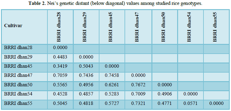 The values of pair-wise comparisons of Nei’s genetic distances (D) between genotypes were computed from combined data for the 165 primers, ranged from 0.0571 to 0.7672, whereas average genetic distance was 0.51 (Table 3). Comparatively higher genetic distance was observed between BRRI dhan47 and BRRI dhan50 genotypes pair (0.7672) followed by BRRI dhan47 and BRRI dhan45 genotypes pair (0.7456) than the other combinations (Table 2). On the other hand, BRRI dhan54 and BRRI dhan55 cultivar pair showed the maximum similarity (0.0571).