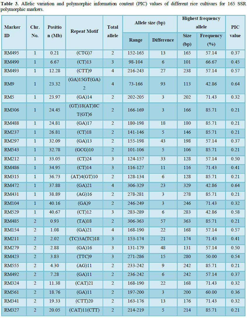 In this study 165 SSR markers showed polymorphism among the tested modern rice cultivars that are commercially cultivated in Bangladesh. The variations of allele number per locus are within the range 2 to 5 with an average 2.58 which is quite comparable to the values reported by Prabakaran et al. [30] (range 2 to 3, mean 2.2) and Joshi [17] (average 2.2 alleles) but quite low compared with those reported Siwach et al. [31] (range 1-8, mean 4.58) and Matin et al. [32] (range 3-7, mean 4.4). Comparatively low allele per locus might be due to the use of lower number of genotypes in the present study. Close genetic make-up would be another cause of low allele number.