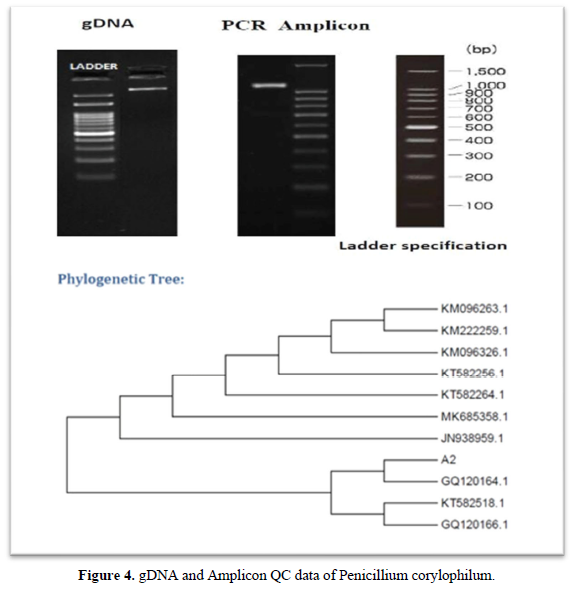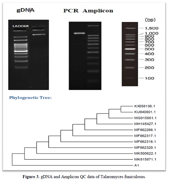 The present study focused primarily on isolating and screening the laccase producing fungi from forest litter of Western Ghats (South India). Eleven fungal isolates were isolated from soil samples. The Potato Dextrose Agar was used for maintenance of fungal isolates. They were qualitatively screened with Guaiacol as a substrate for their future production capacity of laccase. The potato dextrose agar plates which contain 0.02% Guaiacol were inoculated with all fungal isolates and incubated at 30°C for 5 days. Table 1, shows the results of screening tests. The fungal isolates developed reddish brown halo around the colonies after 5 days of incubation, indicates positive for laccase production and lack of reddish brown halo indicates negative for laccase production. The two elite fungal isolates Talaromyces funiculosus (3cm) and Penicillium corylophilum (5cm) showed good laccase activity on Guaiacol plate test. Similar work carried out by [18] isolated laccase producing fungi on PDA plates containing 4 mM of guaiacol showed reddish brown oxidation zone. Rehan et al. [18] also screened laccase producers such as Trichoderma harzianum on potato dextrose agar supplemented with 0.04% guaiacol. The Talaromyces funiculosus and Penicillium corylophilum elite fungal isolates showed the maximum laccases production of 0.00096 U/ml and 0.00033 U/ml in Potato dextrose bouillon following 15 days of incubation at room temperature. Figure 3 and Figure 4 describes the molecular characterization of elite fungal isolates [19]. Senthivelan et al. [18] reported the laccase activity of white rot fungus 3.2 U/ml was measured by UV-Visible spectrophotometer using guaiacol as a substrate. Rehan et al. [18] reported the laccase production of 1.479 U/ml by Trichoderma harzianum which was measured by UV-Visible spectrophotometer using guaiacol as a substrate.
