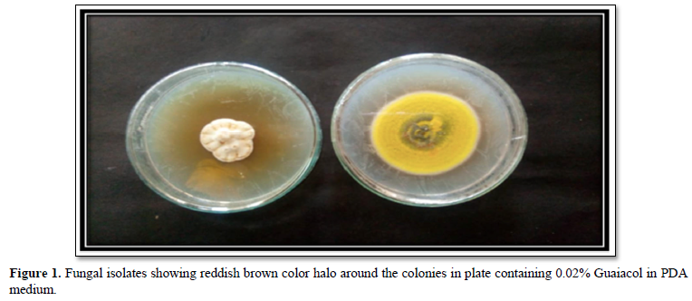 The isolated fungal cultures were further subjected to qualitative screening on Potato Dextrose Agar plates containing 0.02% Guaiacol. The plates were incubated for 5 days at 30°C. The laccase producing fungal strains showed reddish brown halo around the colonies in the plates containing Guaiacol, after 5 days of incubation. The elite isolates from qualitative screening were further subjected to quantitative estimation of laccase [15].