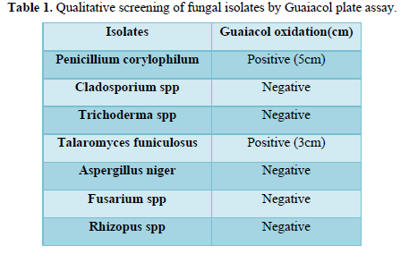 Keywords: Laccase, Guaiacol Indicator, Qualitative, Quantitative, Fungi, A1 (Talaromyces funiculosus), A2 (Penicillium corylophilum)