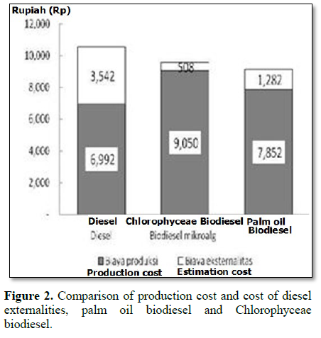Figure 2 shows the ratio of total production cost and externality cost per litre of diesel production, Chlorophyceae biodiesel and Palm Oil biodiesel. When the cost of fuel production is calculated without taking into account the cost of externality, the production of diesel, biodiesel Chlorophyceae and Palm Oil biodiesel is around Rp. 6.992; Rp. 9.050 and Rp. 7.852. Of the 3 production prices, the price of Chlorophyceae biodiesel is not competitive because its production cost is above the diesel market price of Rp. 8.500. Following only the market price and under diesel, fuel supply conditions are always available; both biodiesel opportunities from both Palm Oil and Chlorophyceae to become fossil fuel substitutes become small.
