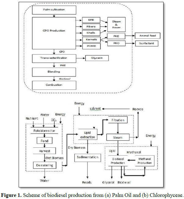 Production of biodiesel from Chlorophyceae oil: The production process of biodiesel from Chlorophyceae oil also consists of 3 stages namely Chlorophyceae culture stage in culture pond or photobioreactor, Chlorophyceae oil production stage and biodiesel production stage. The whole of the biodiesel production system of Chlorophyceae oil is represented in Figure 1b. At the cultivation stage, an important activity process is a process of cultivating Chlorophyceae in a pond or photobioreactor and harvesting process. In cultivation activities, expertise is needed in terms of controlling the administration of nutrients for Chlorophyceae and maintaining the condition of the media to always be in the ideal concentration for the growth of Chlorophyceae. While at the harvesting stage is still reviewed the optimal operational alternatives because at this stage absorb a lot of energy. The process of producing Chlorophyceae and biodiesel lipid production is similar to the stage of CPO and biodiesel production process in Palm Oil. The important thing that distinguishes it is the sonication process that is the process of breaking the walls of Chlorophyceae which absorb much energy and catalyst solution.