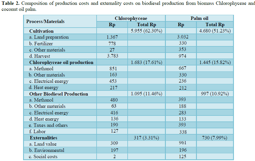 The costs incurred in the production of oil palm biodiesel and Chlorophyceae oil based on the production system as shown in Figure 1a are detailed in Table 2. From the comparison of the cost composition of biodiesel production from coconut palm biomass and Chlorophyceae (Table 2) important, among other things, the largest cost component of production lies in the cost of production of biomass (CPO/oil Chlorophyceae) which reaches 51.23% in oil palm coconut and 62.3% in Chlorophyceae. This information gives attention to biofuel observers, that in order to introduce biodiesel prices to be more economical it must be pressed on the cost of producing biomass of Chlorophyceae or fresh fruit bunches (TBS) of Palm Coconut. The cost savings of biomass production by way of efficient the process of land preparation and the operation of oil palm cultivation and the process of harvesting and saving electrical energy in the process of cultivating Chlorophyceae.