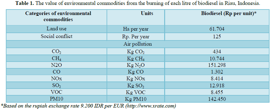 Furthermore, to demonstrate the advantages of the benefit transfer method, the commonly used approach is the willingness to pay (WTP) approach. In this study, the researchers used the environmental commodity economic values from the results of the calculation of Environmental Priority Strategy (EPS) software version 2000. The value of EPS environmental commodities is inferred by the elasticity of paying ability of the applicable country/location [14]. Thus, the adjustment of environmental commodity values from EPS to the value of Indonesian environmental commodities based on the comparative value of per capita income of the country of Sweden and Indonesia. Table 1 presents the costs of environmental commodities from burning biodiesel to Indonesia as calculated from the value of PAP (for European countries). WTP for Indonesia (WTPIna) is calculated by comparing with the European value (WTPEU) using the value of per capita domestic income (GDP).