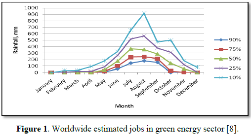 In the present study, the parameters of distribution for the different distributions have been estimated by FLOOD-flood frequency analysis software. The rainfall data is the input to the software programme. The best fitted distribution of different month and season and annual were presented in Table 1. The annual rainfall in 50% probability was found to be 1673.9 mm for Puri district of Odisha [11-14]. During Kharif at 50% probability level, the rainfall is 1220.68 mm whereas only 242.92 mm and 26.43 mm was received during rabi and summer respectively, so water harvesting structures may be made to grow crops during rabi and summer to utilise the water from the water harvesting structures to increase the cropping intensity of the area. It is also observed that at 75% probability level the June, July, August and September received more than 100 mm, so farmers of these area can grow crops in upland areas suitably paddy can be grown followed by any rabi crop in rabi season like mustard or kulthi in upland areas. In Figure 1, the plot between different months and amount of rainfall in different probabilities were shown, It is observed that July month gets highest amount of rainfall compared to other months [15-17].