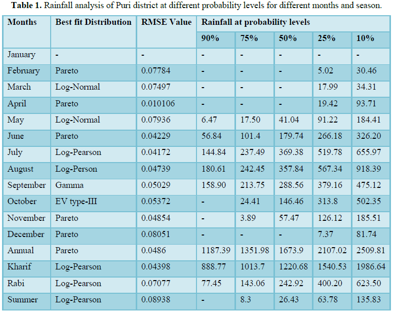 Puri district has latitude of 20°50'40''N and a longitude of 85°09'04''E. The average rainfall at Puri district is around 1673.9 mm, most of the rainfall occurred during kharif. Thus, this study is proposed to be undertaken with the following objective: Probability analysis of annual, seasonal and monthly rainfall data of Puri district.