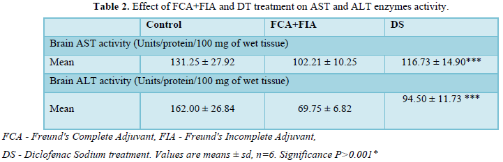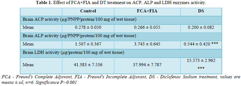 Abbreviations: FCA: Freund's Complete Adjuvant; FIA: Freund's Incomplete Adjuvant; DS: Diclofenac sodium treatment; ACP: Acid phosphatase; ALP: Alkaline Phosphatases; LDH: Lactate Dehydrogenases; AST: Glutamate-Oxaloacetate transaminase; ALT: Glutamate-Pyruvate Transaminase; NSAID: Nonsteroidal Anti-Inflammatory Drugs