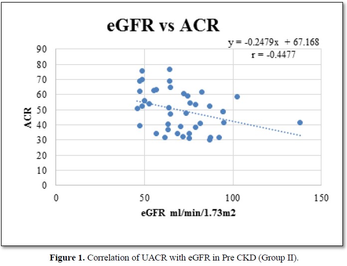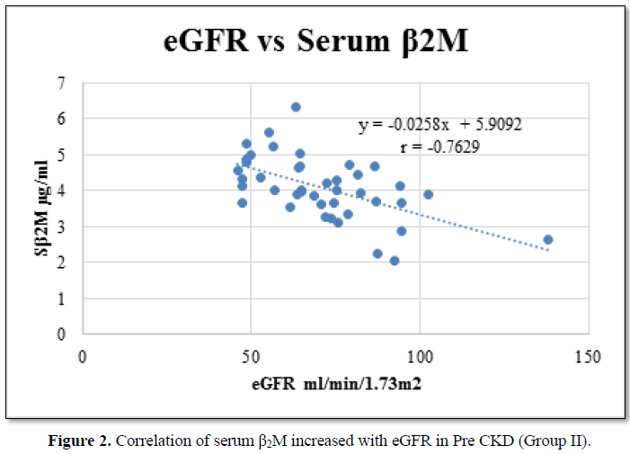 Figure 1 and Figure 2 depicted that in the present study serum β2M showed a strong negative correlation with eGFR as compared to moderate correlation with UACR in pre-CKD patients (Group II).