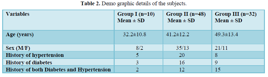 Table 2 depicted that maximum number of cases were of group II and there was statistically significant difference in mean age of three groups (p<0.05). It showed the total no of males in the study group were 64 and females were 26. Most frequent risk factors observed in our study was hypertension (37%) followed by hypertension with Diabetes Mellitus (32%) and Diabetes Mellitus (31%).