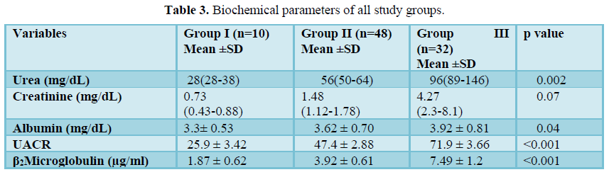 Table 3 showed that there was statistically significant difference seen in urea, albumin, UACR and β2M when compared with three subject groups (p<0.05). On basis of UACR and eGFR study participants were divided in 3 groups as Group I, Group II and Group III. Group I subject showed all normal values of serum creatinine 0.73 mg%, mean serum β2M 1.87 µg/ml ± 0.62 and UACR as 25.9 ± 3.42 indicated no CKD. Group II subjects clinically asymptomatic reported normal serum creatinine 1.48 mg%, but raised β2Microglobulin 3.92 µg/ml ± 0.61and UACR 47.4 ± 2.88 showing statistical significance (p < 0.001) indicated as pre-CKD. All parameters were significantly raised in group III subjects when compared with group I and group II revealed advanced CKD. There was no statistically significant difference in creatinine in group I and II study subjects and showed mean serum creatinine within the normal reference range.