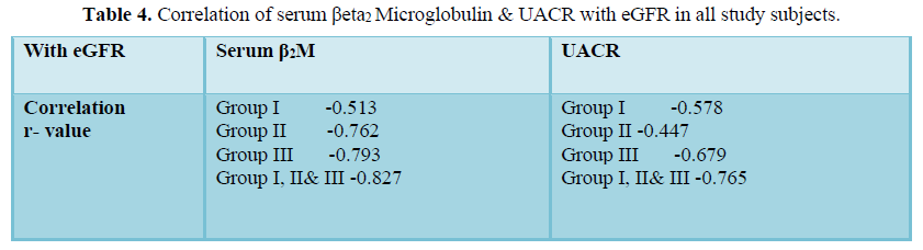 Table 4 revealed that in the present study there was a negative correlation between GFR, serum βeta2Microglobulinand urinary ACR, which indicates that urinary ACR and serum β2Microglobulin increased with decrease in eGFR. This negative correlation was moderate at low levels of urinary ACR and high with increased urinary ACR. The study also showed that this negative correlation was moderate at low levels of serum β2M and very strong as the levels of serum β2M increased.
