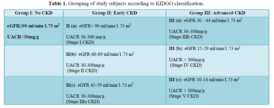 Total 100 subjects were included in the study. Informed consent of subjects was obtained for participation in the study and for blood collection. Demographic data, detailed medical and clinical history of all the study subjects were observed during the study. Patients with Diabetes Mellitus or Hypertension or both for more than 5 years coming for routine follow up in medicine department were included as study subjects. Patients with ESRD, haemodialysis, renal transplant, pregnant females and individuals with any systemic diseases like malignancy were excluded from the study. Based on eGFR and UACR, study subjects were grouped, and sub grouped according to KIDGO classification as given in Table 1.