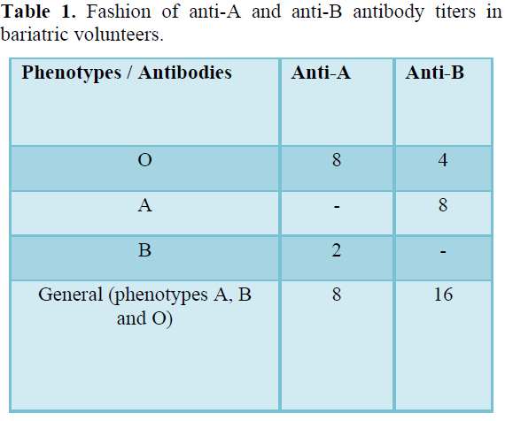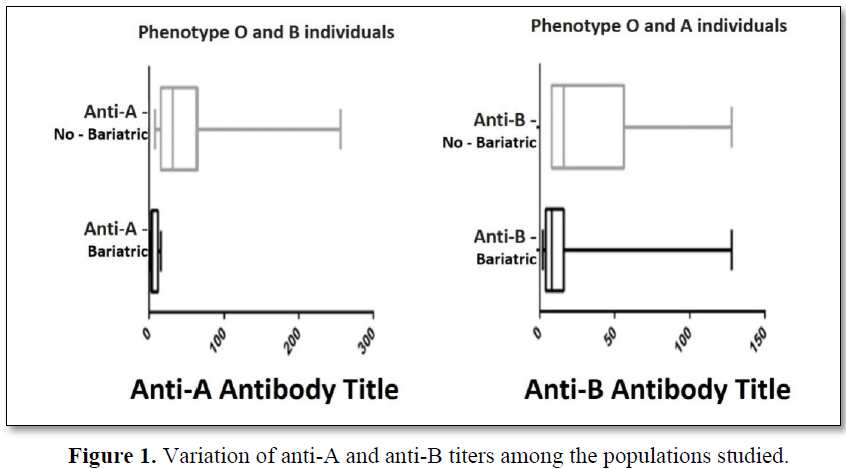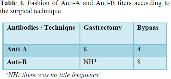 Results: There was significant decrease in antibody titer for anti-A in blood group “O” and “B” (p = 0.0022) between the bariatric group and control group. Just as there was a significant difference (p = 0.0019) with the anti-B title of individuals "A" between the groups. There was not any discrepancy when done phenotyping ABO but noted a trend in the reduction of anti-ABO securities bariatric individuals.