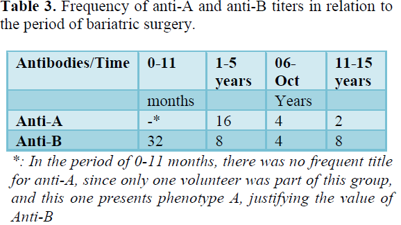 Table 3 shows the frequency of anti-A and anti-B titers in relation to the period of bariatric surgery and Table 4 shows the frequency of anti-A and anti-B titers in relation to the surgical technique performed.