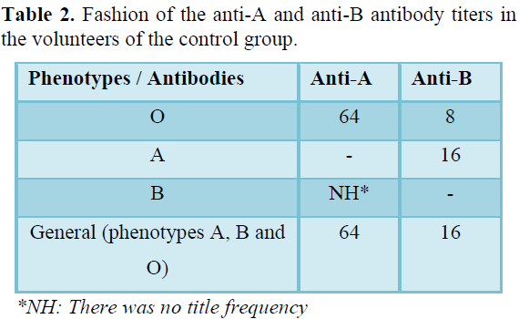 Concerning anti-ABO antibody titers of bariatric volunteers with "O" phenotype the frequent anti-A titre was 8 and anti-B was 4. However, for phenotype A the usual anti-B titre was 8, in phenotype B the common anti-A titre was 2. Of all the phenotypes that had anti-A the frequent titre of antibodies was 4 and anti-B of 8 (Table 1). In the volunteers, the anti-A titre was 64 and anti-B was 8, in phenotype A the common title was 16, in phenotype B there was no frequent titre because only two individuals had this title phenotype and presented different titers. Among all ABO phenotypes in the control group, the usual anti-A titre was 64 and anti-B 16 (Table 2).