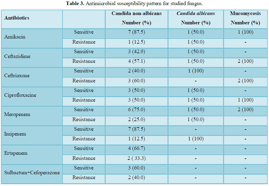 sensitivity to Ceftriaxone (100%); Mucomycosis showed sensitivity to Amikacin