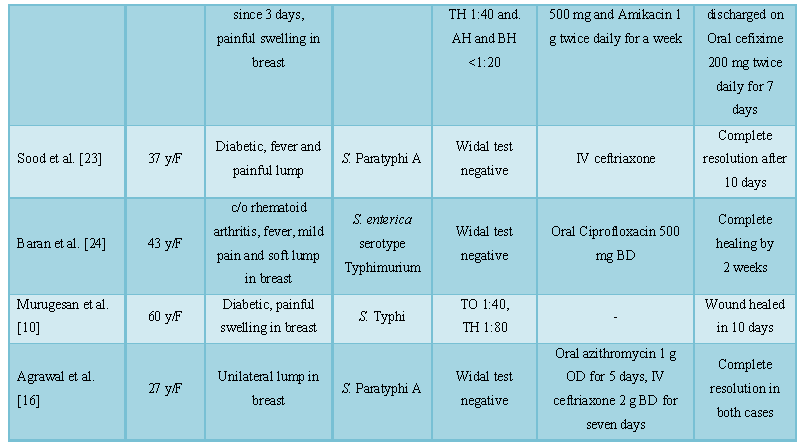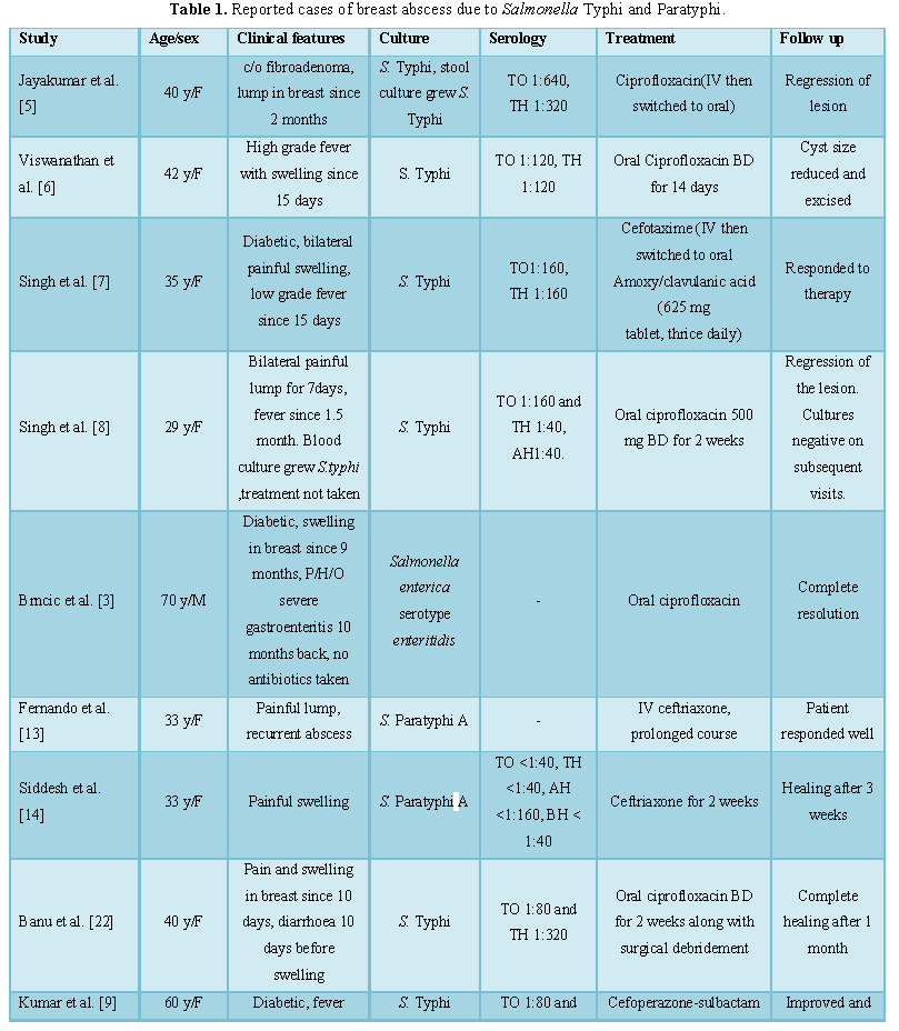 On analyzing the literature available on breast abscesses due to Salmonella spp., it was noted that most of the patients were immunocompetent non lactating females between the age group of 23-45 years [4]. The incidence of breast abscess in typhoid patients was observed to be 0.3% in 1930 by Klose and Sebening and 0.5% in 1937 by Pezinski in a study of 1,196 cases of typhoid. Other authors have also reported similar cases of unilateral breast abscess due to Salmonella Typhi as well as bilateral breast abscesses (Table 1). K Jayakumar et al. reported S. typhi from unilateral breast abscess in a 40-year old non-lactating woman [5]. Similarly, Viswanathan et al. [6] have reported isolation of S. Typhi from a 42-year-old non-lactating female patient with unilateral breast abscess [6]. Singh S et al reported S. Typhi from a 35-year-old non-lactating female patient with bilateral breast abscess [7]. Similar bilateral painful lump in a 29 year old female was reported by Singh G et al. that grew S. Typhi. Kumar et al. and Murugesan et al. reported cases of S.typhi in diabetic patient [8-10]. Cases were also reported from countries like France and USA [11,12]. Though Salmonella breast abscess is a complication of enteric fever seen exclusively in females, Nada [3] have reported the isolation of S. enteritidis from a 70-year-old male patient with unilateral breast abscess.