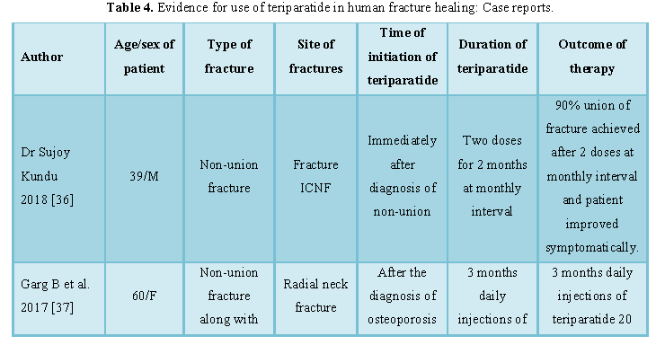 Various case reports of fracture healing with teriparatide use (Table 4) as well as a number of case series [34,35] have been published. A summary of fracture healing by teriparatide is as follows.