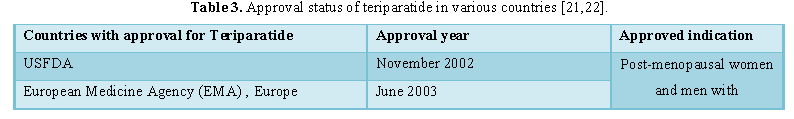 Teriparatide (PT 1-34) is a recombinant drug which is a biologically active component of parathormone. The drug is an osteoanabolic agent approved in various countries for postmenopausal women and men with osteoporosis for prevention of fractures [20] (Table 3).