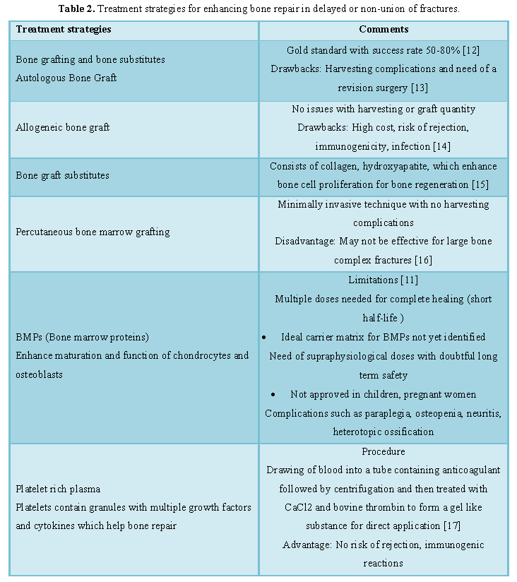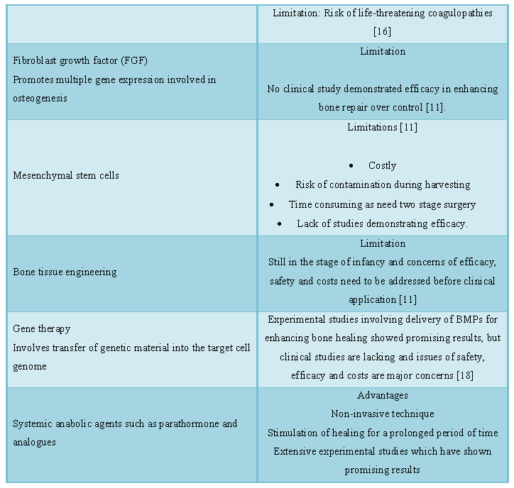 An improved understanding of the pathophysiology of bone repair and remodelling has led to the development of various pharmacological therapies which include orthobiologics such as stem cells, growth factors such as BMPs (Bone mrphogenetic proteins), VEGF (Vascular endothelial growth factor), osteoprogenitor cells, osteoinductive growth factors and anabolic agents (Table 2). These newer therapies have the potential to accelerate fracture repair in case of delayed or non-union of fractures [11].