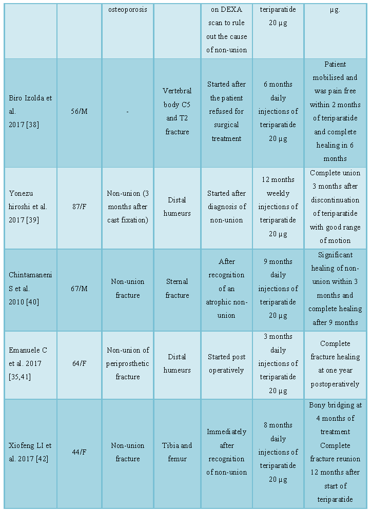 Emanuele C et al. [41] and Xiofeng LI et al. [42] also reported similar case study results of improved fracture healing with teriparatide use in non-union of fracture (Table 4).