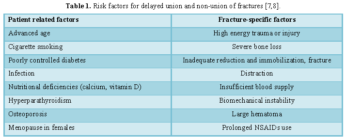 Risk factors for delayed or non-union include the location of the fracture, extent of soft tissue injury and bone loss, inadequate reduction and immobilization, fracture distraction, insufficient blood supply and infection while the patient risk factors include advanced age, cigarette smoking, diabetes, infections, nutritional deficiencies, hyperparathyroidism etc (Table 1) [7]. Early recognition of delayed or non-union of fracture improves outcome of the patient and prevents further disability.