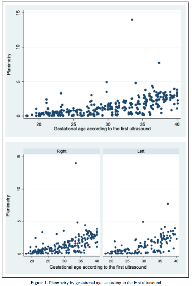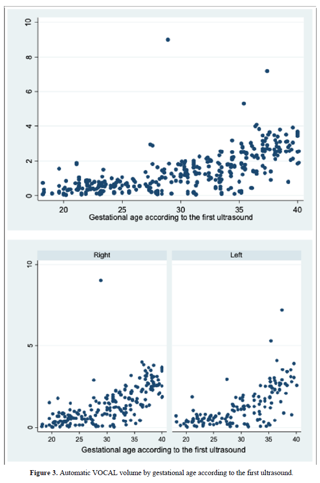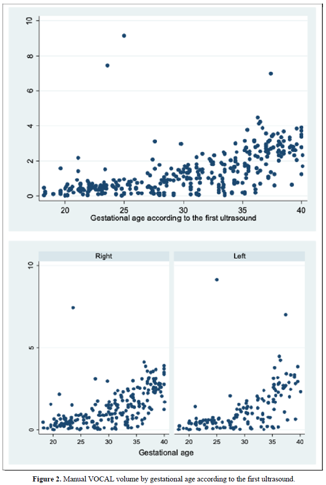 When comparing the median obtained from the volume of the left and right FAG and their average, no statistically significant difference was found using the planimetry volume technique (p-value: 0.62), the manual VOCAL volume (p -value: 0.58) and the automatic VOCAL (p-value 0.75). Spearman's correlation coefficient, for planimetry as automatic and manual VOCAL volumes with respect to gestational age, presented a positive relationship (Spearman’s Rho between 054 to 0.74) (Figures 1-4 and Tables 4-6).