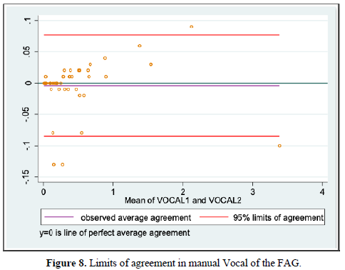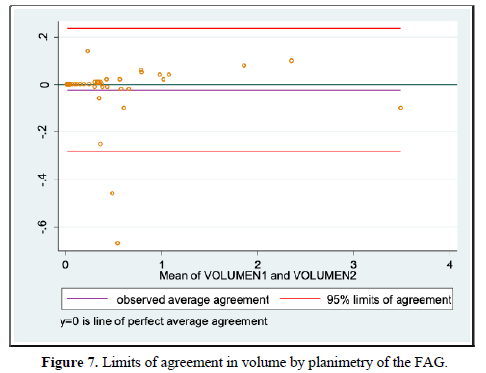 We also evaluated inter-observer agreement for volume by planimetry and manual VOCAL using the Lin coefficient, finding a value of 0.979 [95% CI 0.967-0.991] and 0.998 [95% CI 0.996-0.999], respectively, which expresses that more than 95% of the measurements were similar without statistically significant differences between the data. Similarly, using the Bland and Altman method, we found a difference of -0.024 [95% CI -0.283-0.235] for planimetric volume and -0.004 [95% CI -0.085-0.077] for manual VOCAL volume which means the smallest difference between the measurement data. To our knowledge, this difference had not been reported specifically for the measurements of the volumes of the FAG, which makes this measurement reproducible, provided that the observers have adequate training.