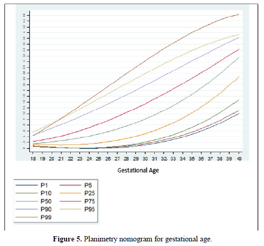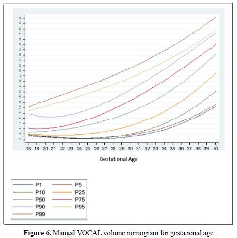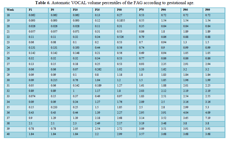 Among the strengths of our study, we use various methods of measuring the volume of the FAG, which allowed us to make a comparative analysis of the results and determine the effectiveness of the different techniques. In addition, we have a sufficient sample size for each gestational age group, so nomograms were made for the volume of the FAG by gestational age, calculating the different percentiles, thus establishing the expected normal values for our population (Tables 4-6) (Figures 5 and 6). We introduce a smoothed polynomial fractional formula where the volume of the FAG is a function of the gestational age and the gestational age squared (Table 10). When evaluating the volume of the left and right FAG, we show that there are no statistically significant differences between the results obtained (P value> 0.05), so we decided not to distinguish the laterality of the gland when generating the nomograms and correlate with other variables.