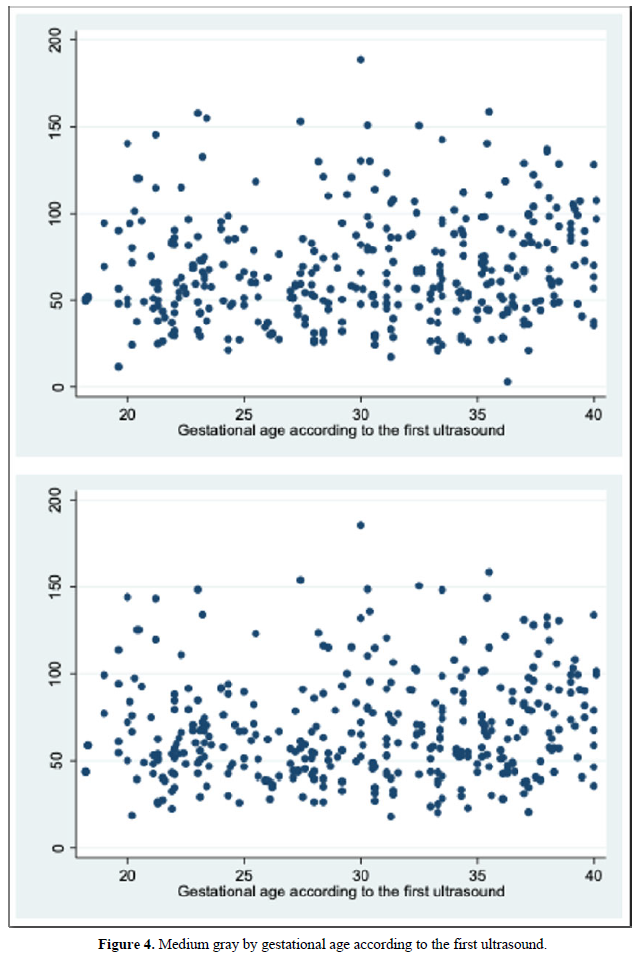 We also calculate the mean gray [31]. In our study, we were able to calculate the mean gray for all cases, configuring ourselves in a simple technique that is automatically achieved after having obtained the virtual volume (VOCAL). Although the FAG presents a gray scale that creates different textures in terms of the dynamic range, that is, it has different nuances due to the sono-echographic characteristics, we were unable to demonstrate a correlation between the voxel gray average with respect to two-dimensional / Pixel images. (Spearman's Rho P> 0.05) (Figure 4) [31]. The above would be explained because the automatic VOCAL has some shapes that did not correlate with the actual shape of the FAG. However, it was also not correlated with the manual VOCAL, which is more faithful to the anatomy of the gland. No correlation was found between the mean gray with the GA. We consider it necessary to carry out future studies in order to establish the real utility of the mean gray [32].