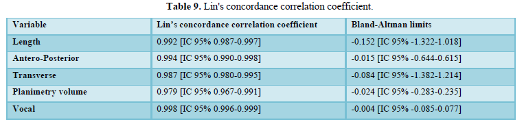 When evaluating the inter-observer agreement for volume by planimetry and manual VOCAL using the Lin coefficient we found a value of 0.979 [95% CI 0.967-0.991] and 0.998 [95% CI 0.996-0.999], respectively. On the other hand, when evaluating the limits of agreement according to Bland and Altman, we found a difference of -0.024 [95% CI -0.283-0.235] for volume by planimetry and -0.004 [95% CI -0.085-0.077] for the VOCAL volume Handbook (Figures 7 and 8 and Table 9).