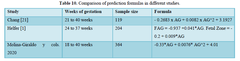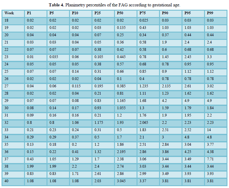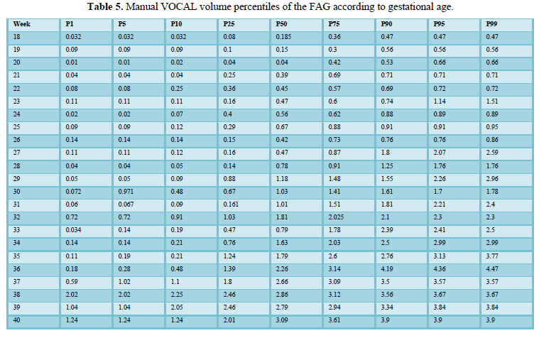 Chang [21] obtained one of the first reference curves for the volume of the FAG using 3D ultrasound, in this study the 5th and 95th percentiles reported at 37 weeks of gestation by planimetry were 3.33cc and 5.55cc, respectively. While in our study at the same gestational age they were 1.24 cc for the 5th percentile and 3.9cc for the 95th percentile. The above shows a marked difference between the Taiwanese nomogram, which represents the eastern population, with our Latin-American population, while the study by Helfer [1], using VOCAL, found smaller-volumes, such as 0.248 and 1.15 cc for the 5th and 95th percentile, respectively, -at 37 weeks. Our group evaluated the total volume that includes the fetal area and the definitive area. Jamigorn et al. [8] measured the FAG by 2D ultrasound differentiating the fetal and definitive area by gestational age, however, it did not report FAG volumes.