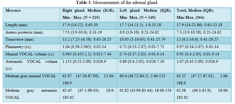 Conclusions: Fetal adrenal gland is measurable between 18 and 40 weeks of gestation; the planimetry and the VOCAL technique are comparable to its measure, finding a directly proportional relation between its growth and the gestational age. The preliminary volumes of the fetal adrenal gland obtained are comparable to those reported in the literature.