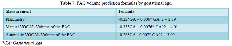 Table 7 shows the formulas for predicting volumes based on gestational age. The automatic VOCAL volume of FAH was determined according to the following formula: -0.26xEG + 0.007 * EG ^ 2 + 3.09 and the planimetry was given by the formula: -0.22 * EG + 0.006 * EG ^ 2 + 2.39. The formula corresponding to the manual VOCAL volume was: -0.33 * EG + 0.0076 * EG ^ 2 + 4.01 (Table 7).