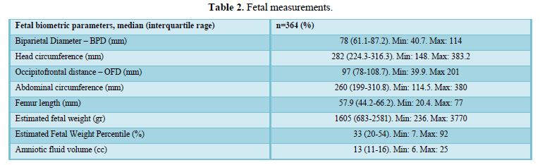 The BPD between 40.7 to 114 mm, with a median of 78 mm (IQR 61.1-87.2). The head circumference between 148 to 383.2 mm with a median of 282 mm (IQR 224.3-316.3). The occipitofrontal diameter between 39.9 to 201 mm with a median of 97 mm (IQR 78-108.7). The abdominal circumference between 114.5 to 380 mm with a median of 260 mm (IQR 199 to 310.8). The length of the femur between 20.4 to 77 mm with a median of 57.9 mm (IQR 44.2-66.2). The estimated fetal weight between 236 to 3,770 gr, with a median of 1,605 gr (IQR 683-2581) (Table 2).