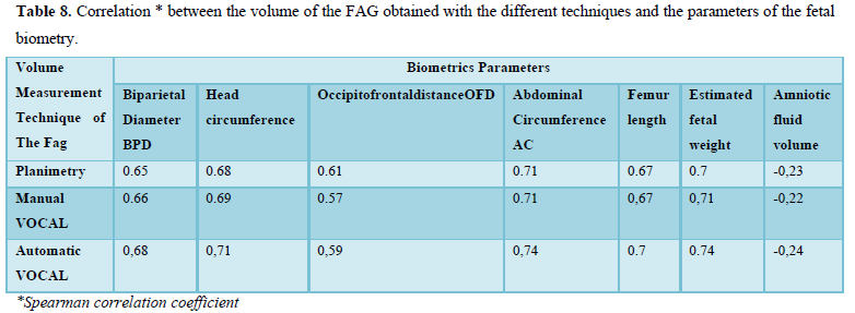 When evaluating the correlation between volume by planimetry and fetal biometry parameters, an intermediate positive correlation was found (Spearman's rho between 0.6 to 0.74) with biparietal diameter, head circumference, abdominal circumference, femur length and estimated fetal weight. A weak negative correlation with the volume of amniotic fluid. Those results also apply to manual and automatic VOCAL volume (Table 8).