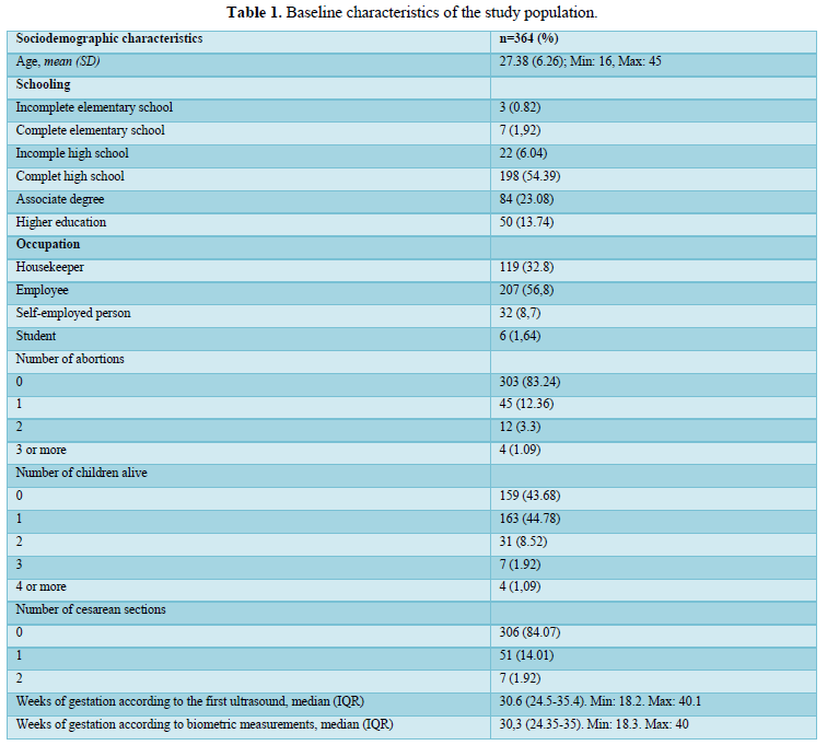 A total of 364 patients who underwent obstetric ultrasound evaluation, with gestational ages between 18 and 40 weeks, from two Latin American Maternal Fetal Medicine Units in the period from September 2019 to March 2020 were included. The age of the patients was on average 27.4 (16-45, +/- 6.26 years). Gestational age was calculated by the first ultrasound, presented a minimum value of 18.2 weeks and a maximum of 40.1 weeks (Median = 30.6 weeks RIQ 24.5-35.4). 54.4% (198). 43.7% (159) were nulliparous, 56.3% (205) had at least one living child. 16.8% (61) of the patients had previous gestational losses. 84.1% (306) had a history of vaginal delivery while 15.9% (58) gave birth by caesarean section (Table 1).