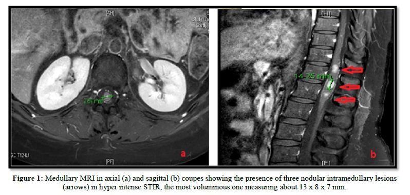 the diagnosis is essentially based on medullary MRI which most often shows nodular lesions in the medullary canal in T1 hypo signal - T2 hyper signal and after injection of Gadolinium [6].