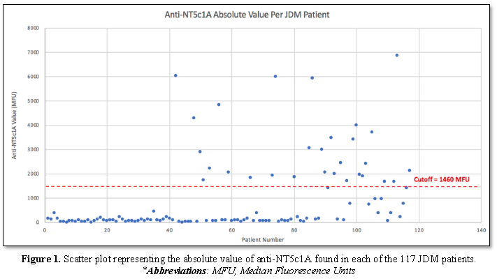 In summary, the frequency of anti-NT5c1A in JDM was 24.8% in our international multi-centre JDM cohort. Although anti-NT5c1A antibodies are relatively common in JDM compared to other connective tissue diseases, they have a low sensitivity but a relatively high specificity for JDM among pediatric patients. This is the first study to report anti-NT5c1A in patients with pSLE, pLSc, and pSSc. Screening for anti-NT5c1A antibodies using HEp-2 IFA is unlikely to be useful in detecting these autoantibodies.Keywords: Anti-NT5c1A, Autoantibodies, Juvenile Dermatomyositis, Biomarker, Pediatric systemic autoimmune rheumatic diseases