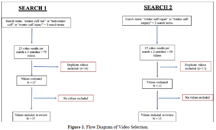 YouTube was searched based on terms patients would most likely to use to find information about rotator cuff tears. Search 1 was conducted in January 2019 for videos containing the following search terms: (1) rotator cuff tear (2) rotator cuff injury, and (3) torn rotator cuff. The search was performed by 2 reviewers (blinded for review) on the same day by accessing www.youtube.com via an Incognito window on a Google Chrome browser from an IP address in Vail, Colorado. Video urls were recorded from the top 25 results from each search, for a total of 75 results. Duplicate videos were then excluded. Exclusion criteria were non-English language videos or those unrelated to rotator cuff pathology. In order to address potential search term bias, an additional search (Search 2) was conducted on YouTube with more of a treatment focus, with the search terms (1) rotator cuff repair and (2) rotator cuff surgery. The same exclusion criteria for Search 1 were applied for Search 2. Search methodology is shown Figure 1. Our study was exempt from institutional review by our board of ethics due to use of public access data alone.
