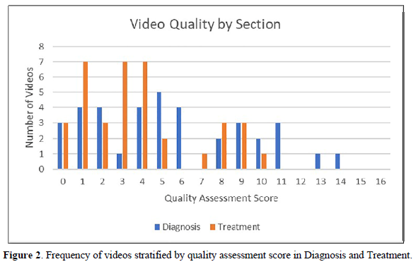 Results: Search 1 yielded 37 videos to evaluate. The mean quality scores were significantly (p=0.04) different, with 5.33 for Diagnosis and 3.73 for Treatment. Search 2 yielded 33 videos. The mean quality scores were 3.01 for Diagnosis and 3.7 for Treatment. Search 1 and Search 2 had similar treatment scores (p > 0.05) but Search 2 had a worse Diagnosis score than Search 1 (p = 0.005). Videos that included a physician-sponsor had significantly higher average total scores than videos without a physician-sponsor (11.1 vs 5.0, p = 0.03). The number of views per video was not significantly correlated with average total score (rs = - 0.23, p = .17).