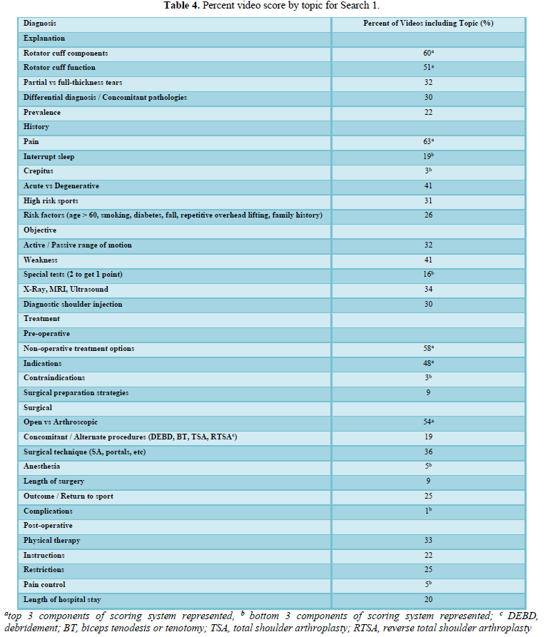 Although YouTube provides a user-friendly platform to access and share information, healthcare information is not peer-reviewed prior to uploading on the site. Several studies have shown that the quality of healthcare information on YouTube is often variable and at times inaccurate or misleading [5-7]. Recent studies on rotator cuff tear education on websites found poor and incomplete information, and presents a need for improvement in the quality of information presented to patients [8-9].Without adequate assessment of video information on YouTube for rotator cuff tears, patients’ expectations and knowledge about their diagnosis and treatment can be negatively impacted [10].