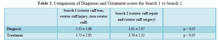 Overall, Treatment as a whole scored significantly lower than Diagnosis for Search 1. While many videos appropriately discussed possible “non-operative treatment options” and “open vs arthroscopic” approaches, “contraindications” and “complications” were only mentioned in an average of 1 and 0.5 videos, respectively. These results are similar to the findings reported in a similar study on femoro acetabular impingement by MacLeod et al. [7]. Furthermore, “contraindications” and “complications” were not explained in any new videos after Search 2 was conducted. The lack of discussion of information relevant to treatment of rotator cuff tears can impact patients’ understanding and expectations of treatment, especially in situations where a patient-physician relationship has not been well established.