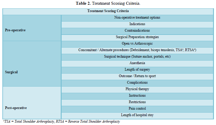 After establishing the final list of videos, video information was independently scored by two medically trained evaluators (blinded for review). In order to score the videos, an author-derived score was created. The components of the scoring system were created by fellowship trained orthopedic surgeons (blinded for review) and consisted of elements significant to the diagnosis and treatment of rotator cuff tears. The scoring system was divided into two sections: Diagnosis and Treatment. This approach was modeled after the scoring system created by Macleod et al to evaluate video quality regarding femoroacetabular impingement [7]. Each section was subdivided into three subsections. Explanation, history, and objective findings comprised the subsections within the Diagnosis section (Table 1). The Treatment section was divided into preoperative care, surgical technique, and postoperative care (Table 2). Individual criteria within each subsection were awarded one point for explanation within the video. A score of zero was awarded if no explanation or mention occurred. Each section (Diagnosis and Treatment) had a point total worth sixteen points, with the maximum score for a video being 32 points. Each reviewer scored the video twice to evaluate intra as well as inter-rater reliability. Scores from each reviewer were combined and averaged to generate mean quality scores for each video included.