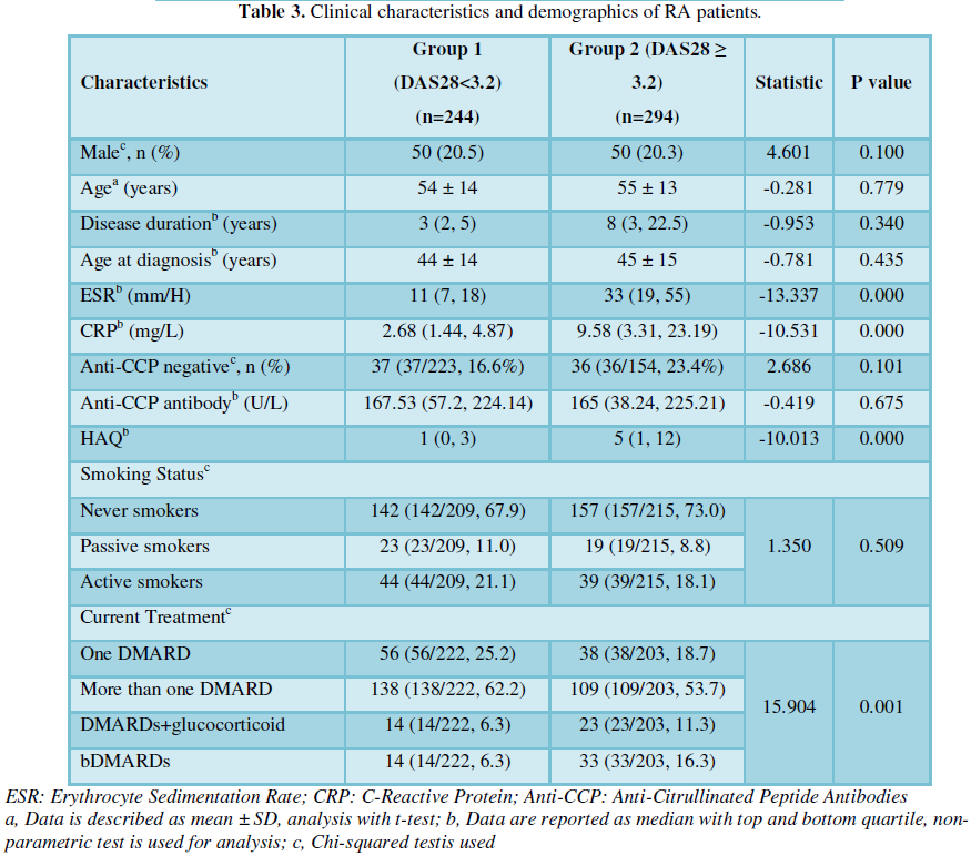 disease duration, age at symptom, smoking status and treatments (one DMARD,
