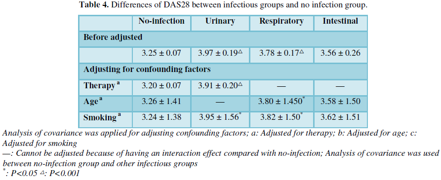 28-joint Disease Activity Score (DAS28) and the infections one month before the