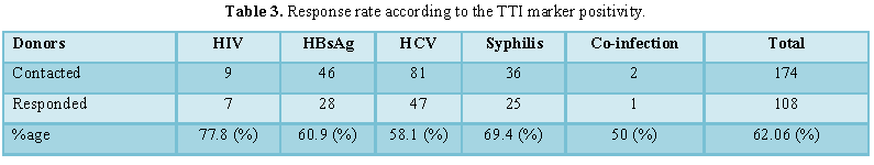which 174 (69.3%) were contacted and 77 donors (30.7%) could not be contacted (Table 2) as either their number could
