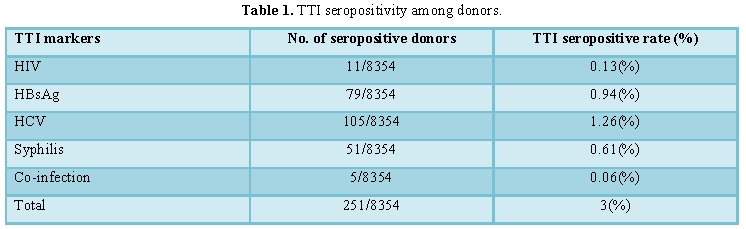 be seroreactive for TTI diseases. 11 (0.13%) donors were HIV positive, 79